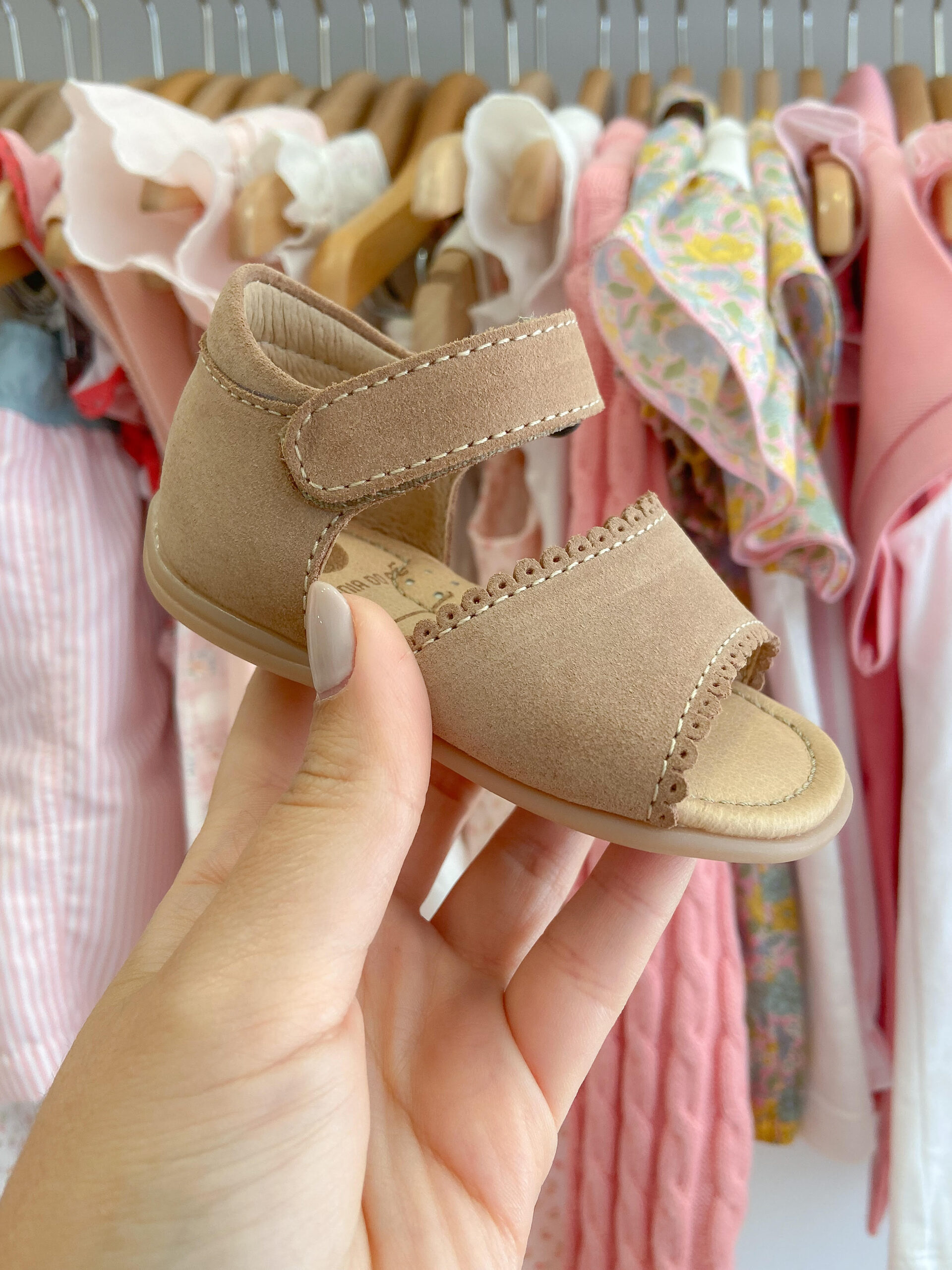 Sandálias de bebé em pele carneira. Possuem reforço no calcanhar e sola antiderrapante. Modelo indicado para os primeiros passos. Fabrico nacional.