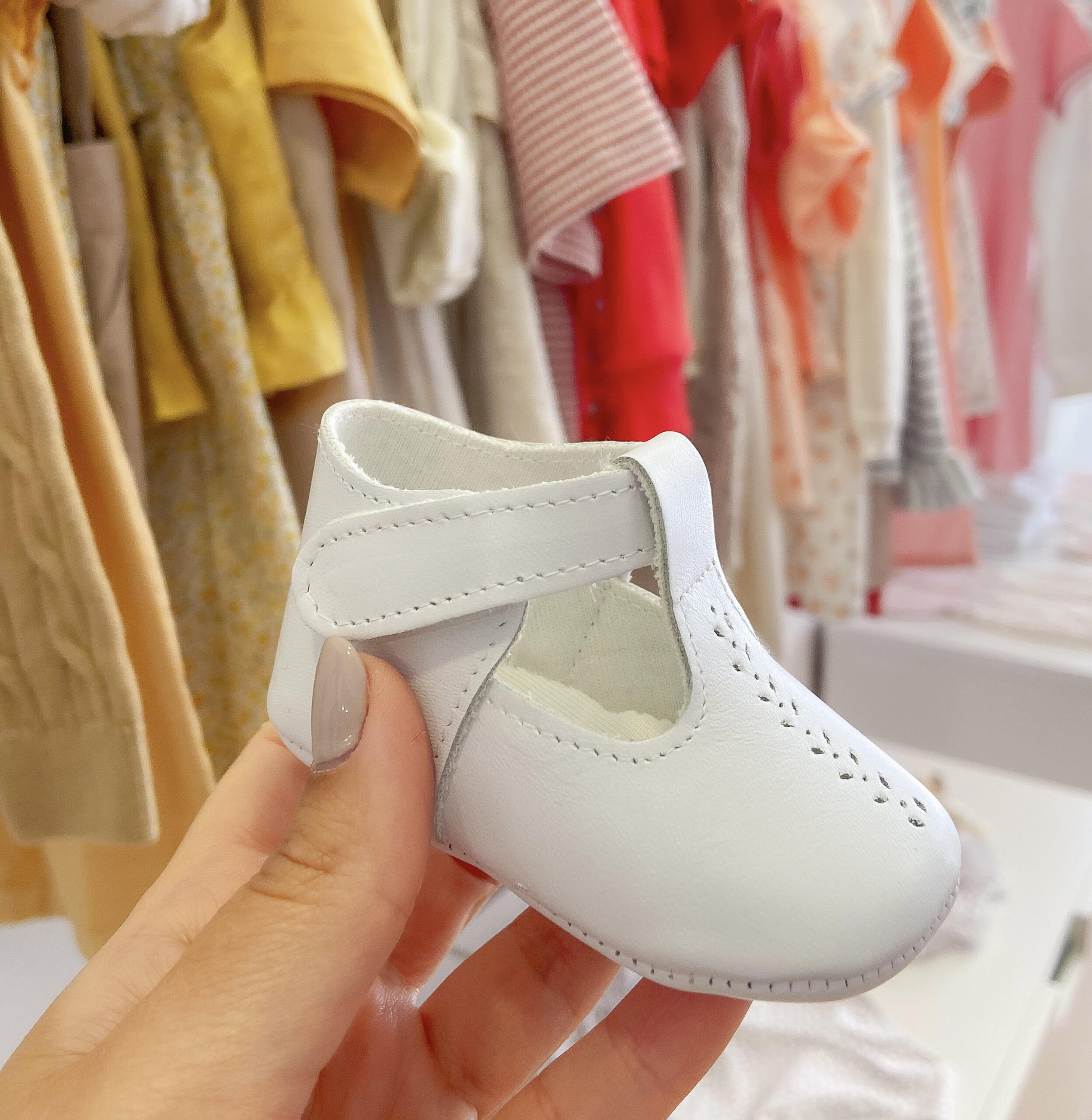 Sapatos em pele branca, apertam com velcro. Ideal para bebés.