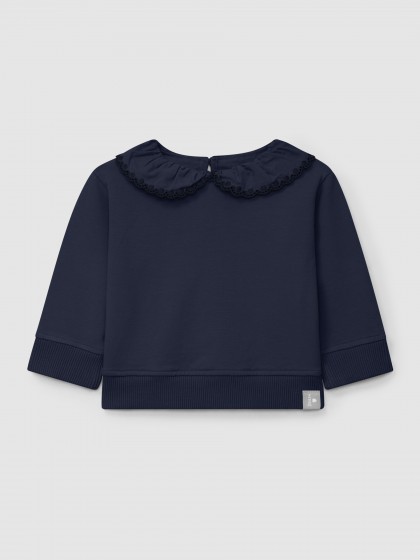 Sweatshirt em felpa cardada de algodão orgânico com gola de folho bordado. Abertura em lágrima nas costas.