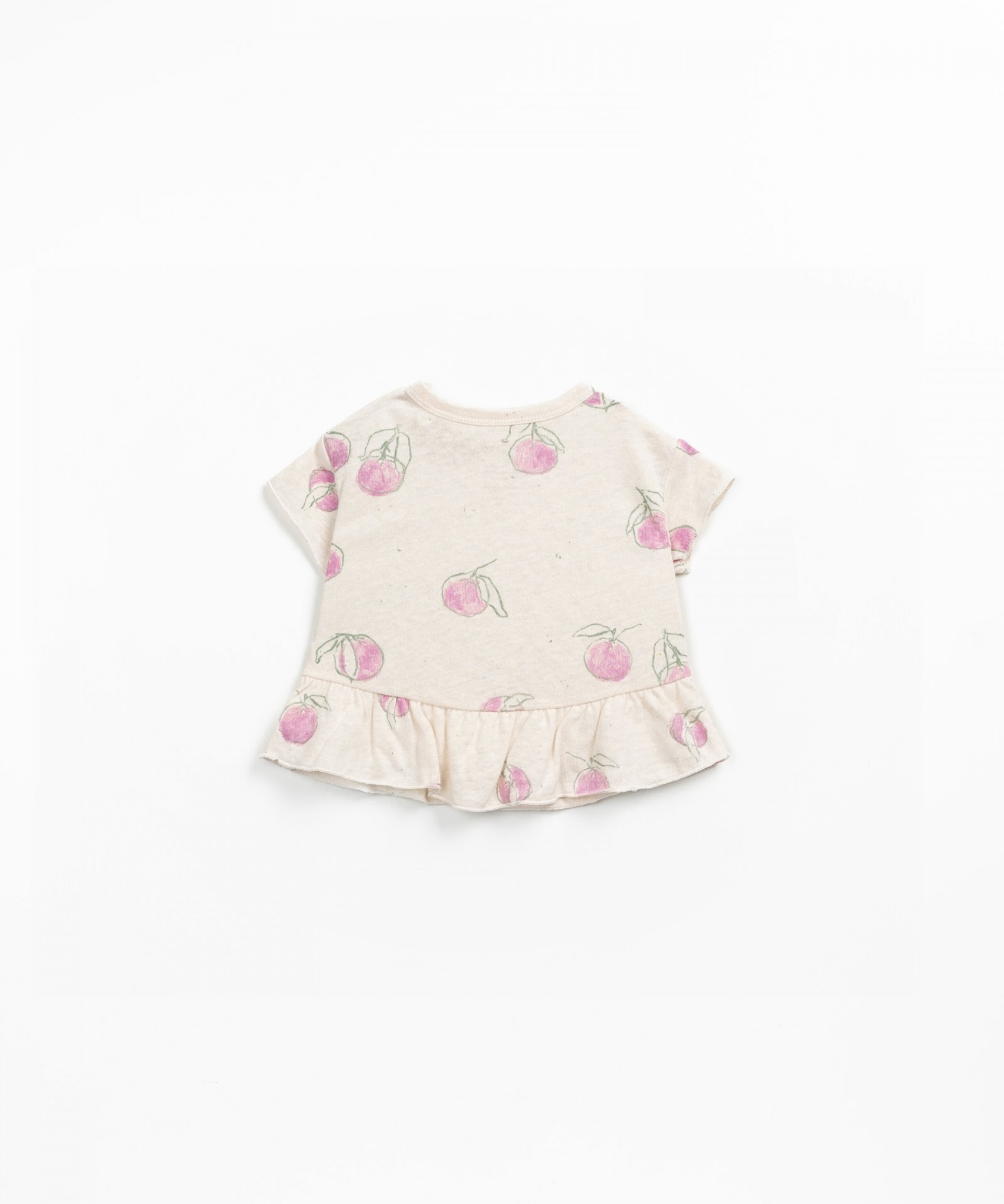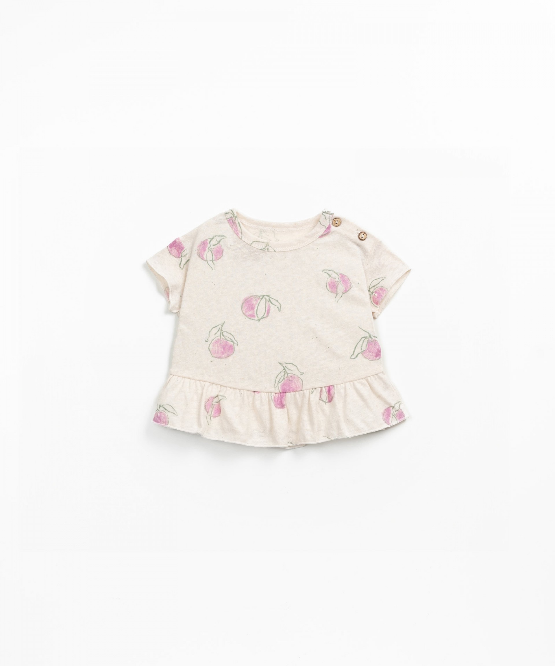 Esta t-shirt é feita em malha de algodão orgânico e linho, na cor Grés. É um modelo com decote redondo e ombros ligeiramente caídos, tem abertura no ombro com botões de coco, encaixe de folho no fundo e estampado de laranjas.