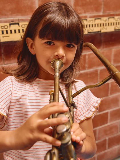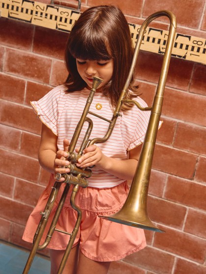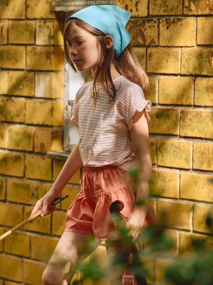 T-shirt em malha slub de riscas 100% algodão. Detalhe de folho na mangas com picueta em cor contraste.