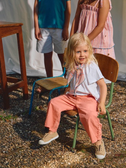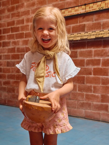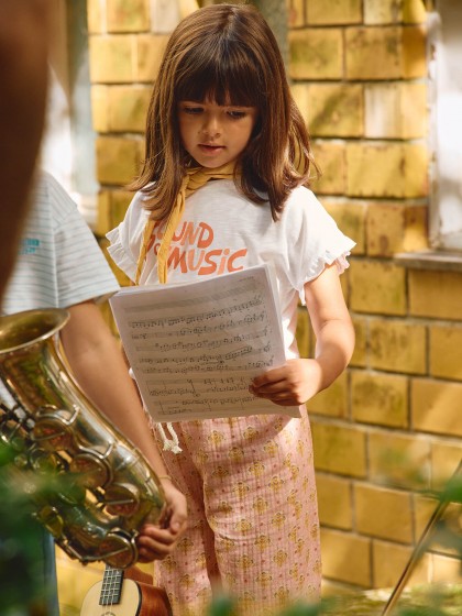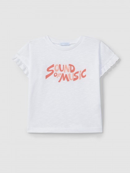 T-shirt em malha slub 100% algodão com estampado “Sound of music”. Detalhe de folho nas mangas.
