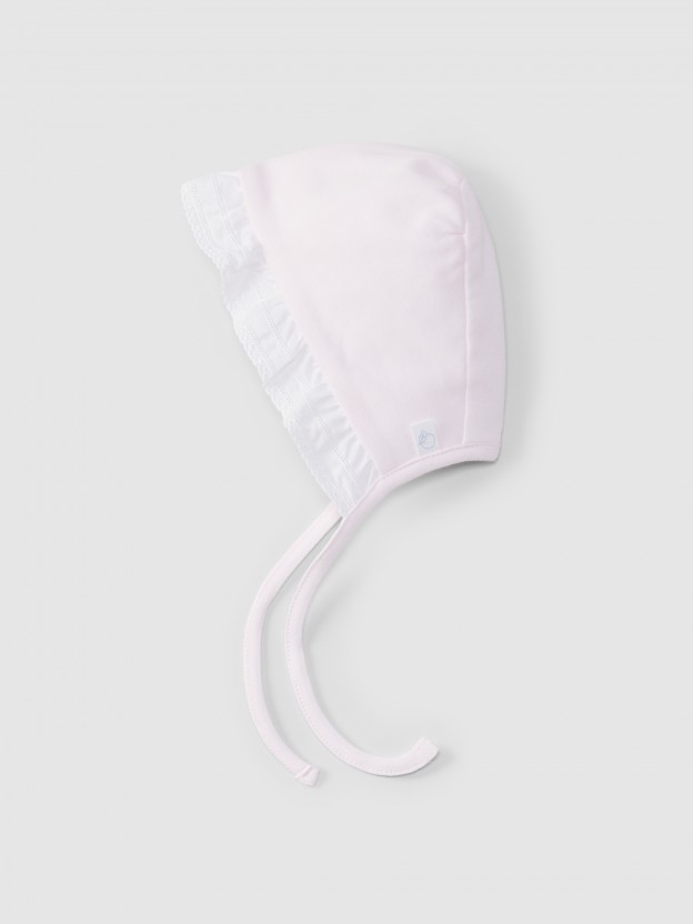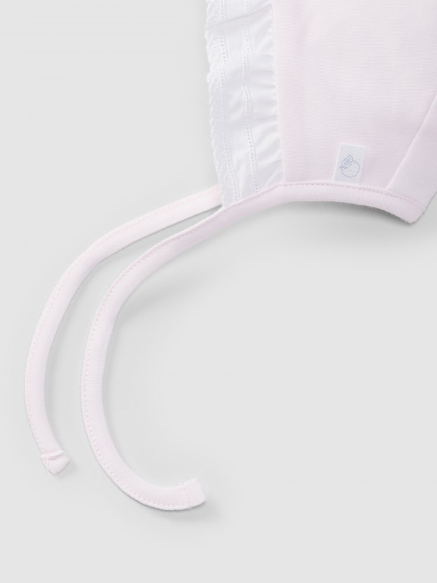 Touca em malha de algodão com aplicação de folho em bordado inglês. Aperta com fita.