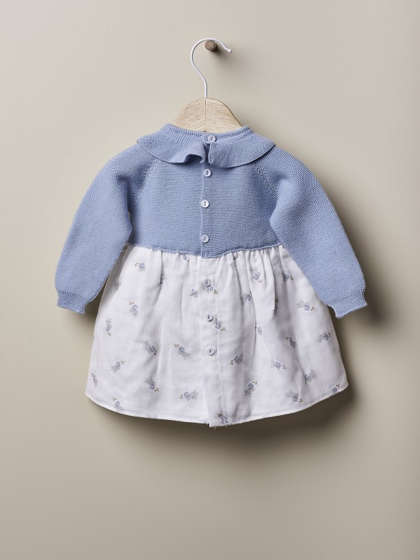 Vestido de manga comprida ideal para meninas. A parte do peito do vestido DEAR BUNNY IN THE SNOW é suavemente tricotada em lã merino extra fina, com folho na gola. A saia é produzida em tecido suave de algodão orgânico com estampado de coelhinhos amorosos em fundo pérola, forrada em algodão leve para maior conforto. Aperta nas costas com botões de madrepérola. Produzida com a tecnologia Wholegarment, esta peça é completa e sem costuras, para maior conforto do seu bebé.