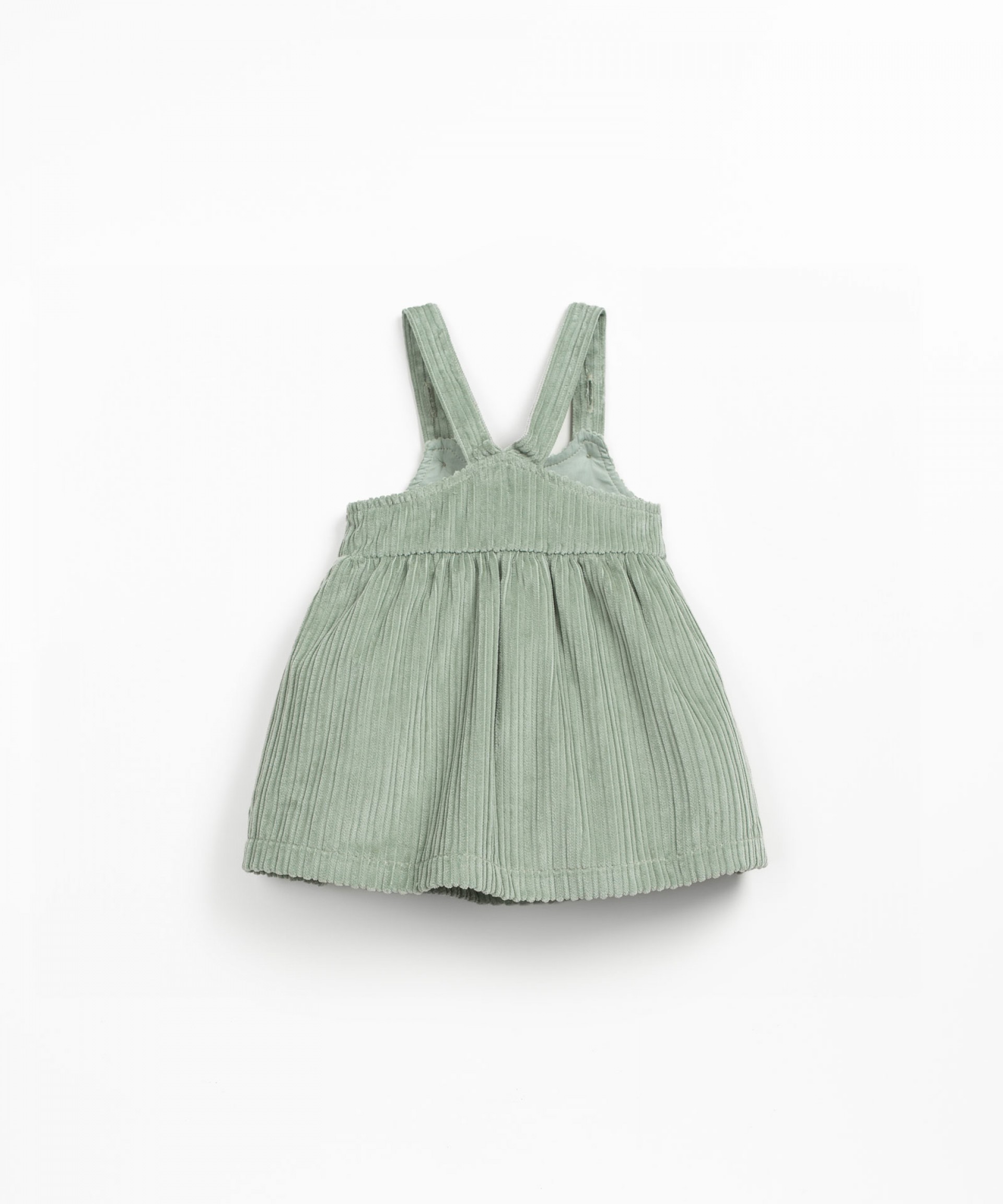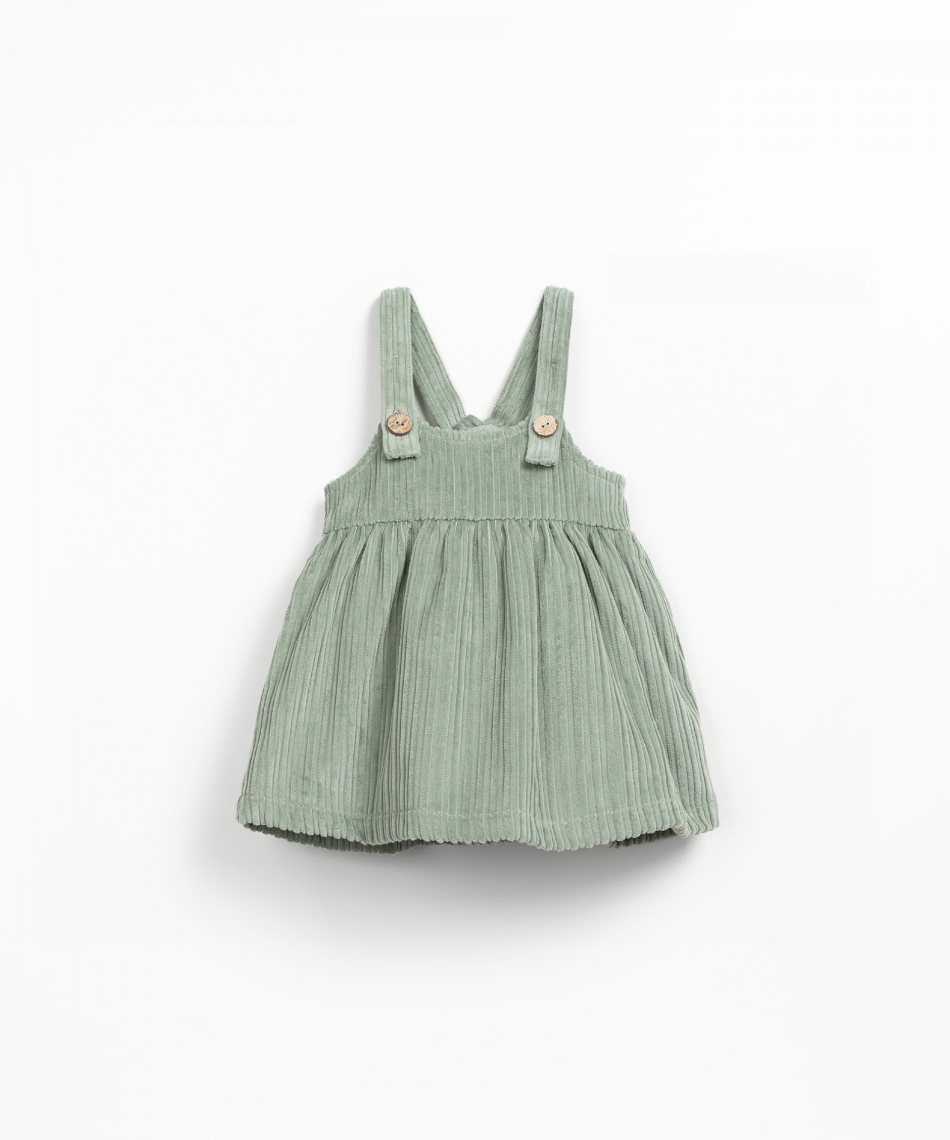 Este vestido em bombazine é feito com mistura de algodão e algodão reciclado, na cor Verde Claro. É um modelo com alças e abertura frontal regulável com botões de coco.