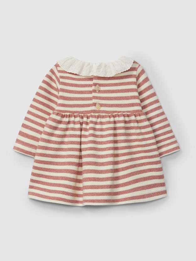 Vestido em malha jersey de algodão com estampado de riscas e gola de folho bordada. Aperta com botões Laranjinha nas costas.
