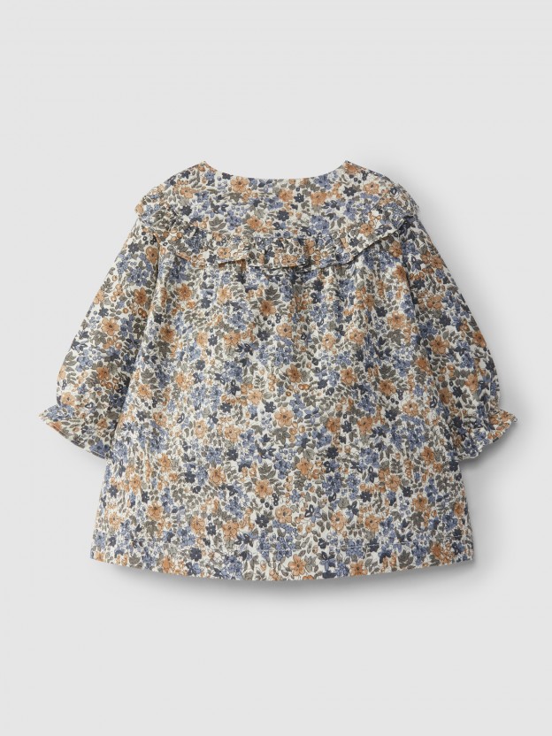 Vestido em tecido 100% algodão orgânico com estampado floral. Encaixe de folho no peito, costa e mangas. Aperta com botões na frente a todo o comprimento.