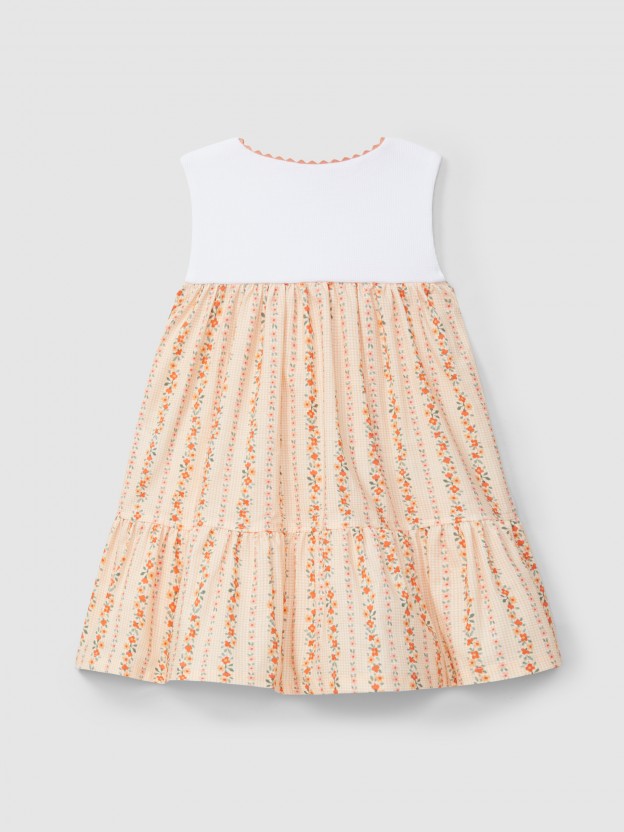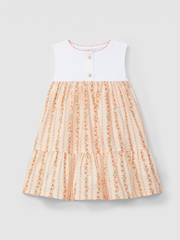 Vestido 100% algodão. Parte de cima em malha waffle com detalhe de espiguilha em cor contraste no decote. Parte de baixo em tecido com estampado micro-vichy e flores. Aperta com botões Laranjinha no peito.