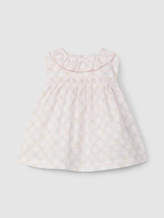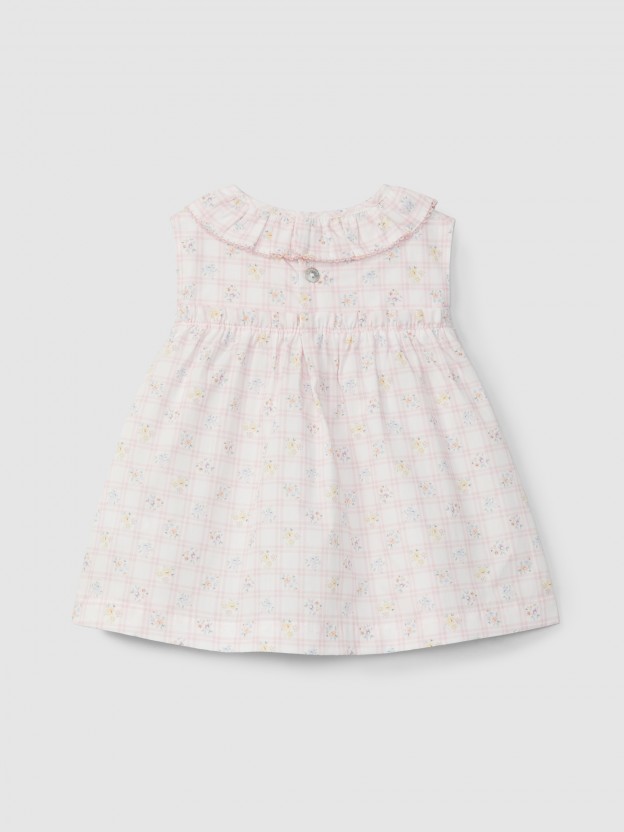 Vestido em tecido 100% algodão com estampado de quadricula e flores. Gola de folho com detalhe de picueta à cor. Aperta nas costas com botões madrepérola Laranjinha e mola escondida.