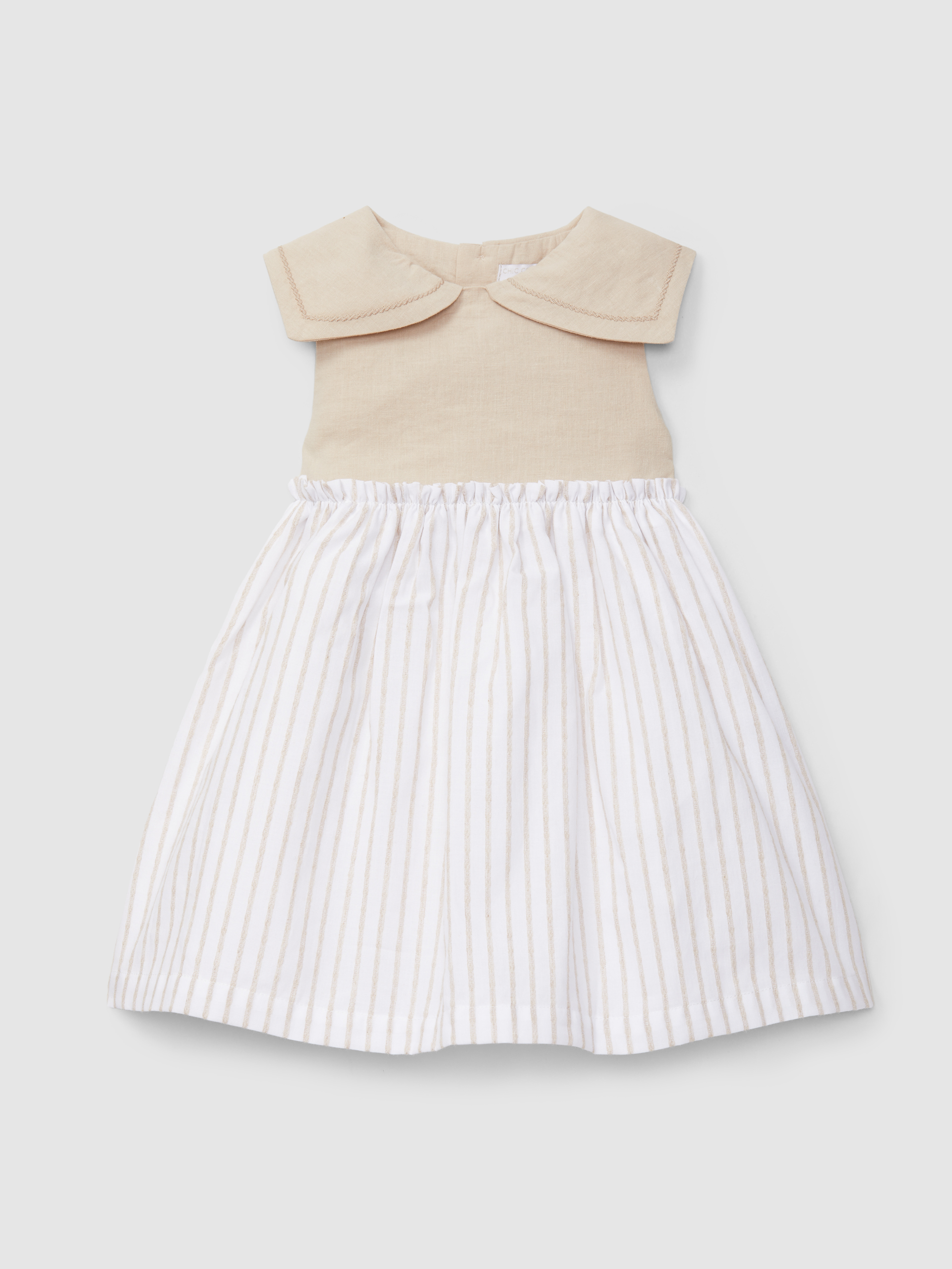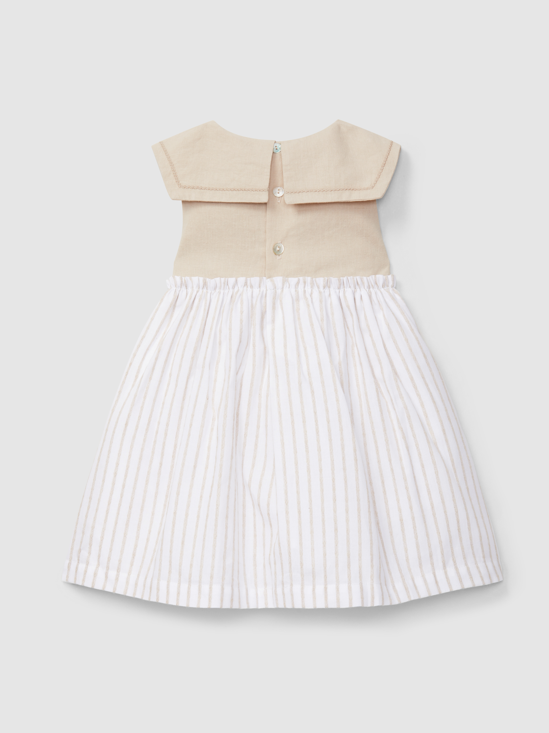 Parte de cima em linho com gola marinheiro e detalhe de bordado à cor. Parte de baixo em tecido de algodão com riscas em relevo. Aperta com botões madrepérola Laranjinha nas costas.