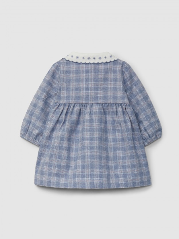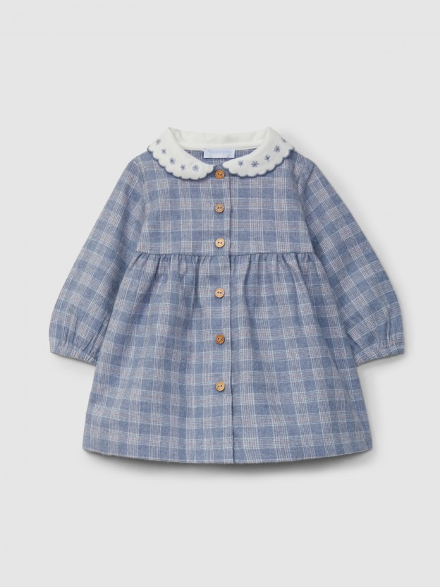 Vestido em tecido 100% algodão com estampado xadrez. Gola redonda em tecido com bordado exclusivo Laranjinha . Aperta na frente com botões de madeira.