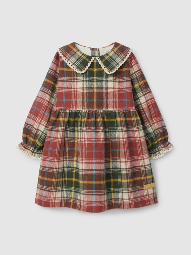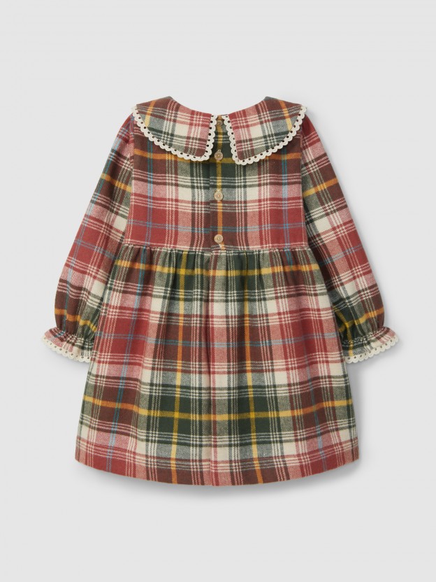Vestido xadrez em flanela 100% algodão macia e quente. Detalhe de renda nas gola e punhos. Aperta com botões Laranjinha nas costas.