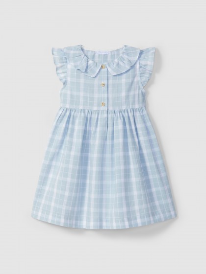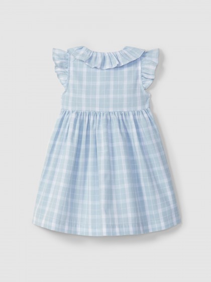 Vestido em tecido 100% algodão com estampado de xadrez. Detalhe de folho na gola e mangas. Aperta com botões Laranjinha no peito.